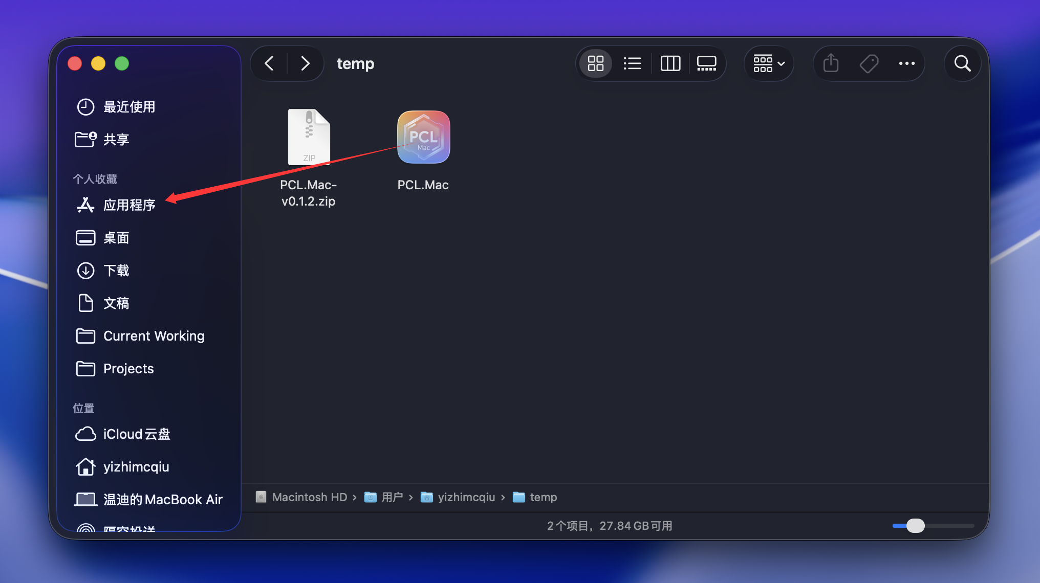 下载 PCL.Mac-vX.X.X.zip 后,请将其解压,并将“PCL.Mac”拖至“应用程序”文件夹中。